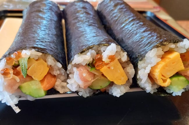 きゅうり、たまご、いくら、サーモン、ねぎとろ、大葉の入った海鮮恵方巻です。