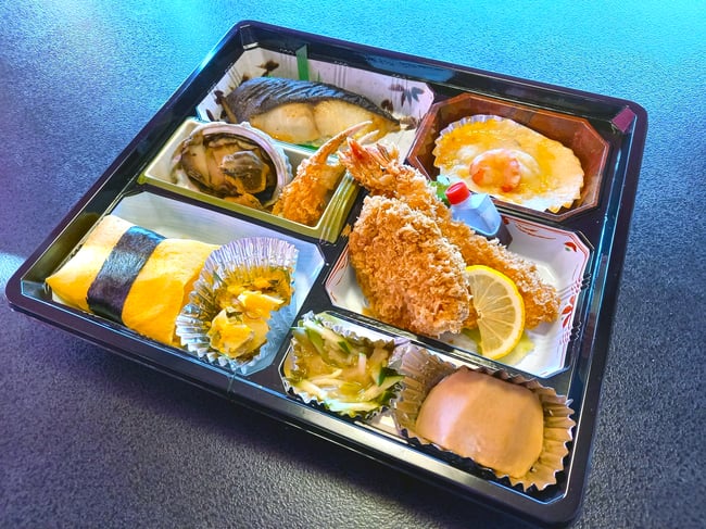 【メニュー内容一例】天ぷら、前菜、焼魚、白身さかなのチーズ焼き、酢の物、茶巾着、お刺身、ホタテフライ(内容は仕入れや季節によって変わります)