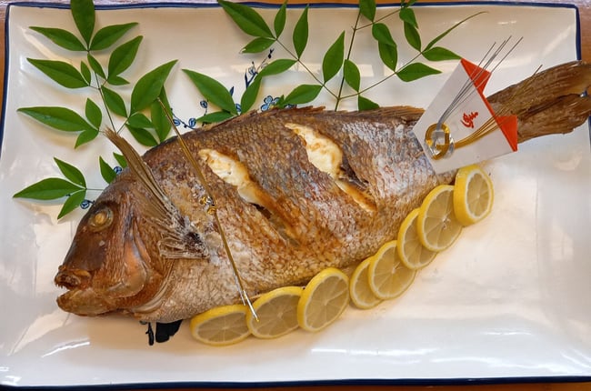 様々なお祝い事でテーブルを豪華に彩る「鯛の姿焼き」をテイクアウトでご用意いたします。